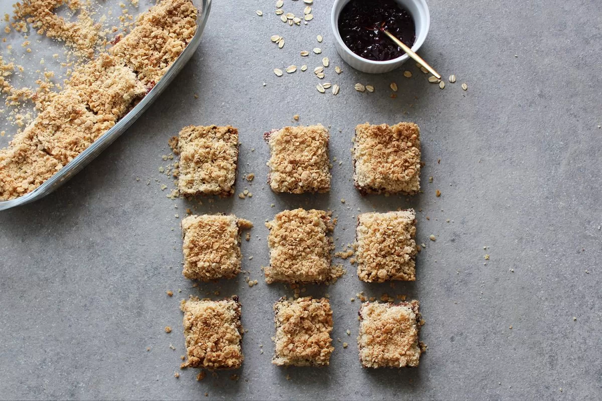 Jums reikės:1 stiklinės viso grūdo avižinių dribsnių, 100 g kvietinių miltų, 50 g rudojo cukraus, 140 g tirpinto sviesto, mėgstamo džemo, žiupsnio druskos. Trupininiams: 1 stiklinės greitai paruošiamų avižinių dribsnių, 1 stiklinės miltų, 1/3 stiklinės cukraus, apie 70 g tirpinto sviesto, žiupsnio druskos.