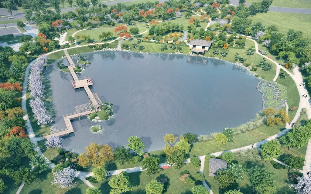 Aplink tvenkinį ir kitur sklypo teritorijoje augantys medžiai ir jų masyvai, aplink kuriuos nebus vykdomi grunto darbai, bus paliekami kaip vietovės charakterį pabrėžiantys elementai. Papildomai bus gausiai želdinama naujais įvairaus dydžio medžiais – jų suplanuota apie 670 – ir krūmais, taip suformuojant naujus želdinių masyvus, kurie kurs jaukias vidines sodo erdves ir tuo pačiu atskirs nuo intensyvios aplinkinės infrastruktūros.