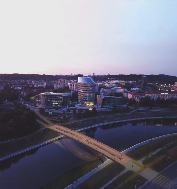 Projektuotojai (projekto vadovas Justas Petkevičius, architektai Algimantas Neniškis, Andrė Baldišiūtė, Gilma Teodora Gylytė, Sabina Daugėlienė, Ignas Uogintas), suplanavo 109 m ilgio, 13 m pločio pėstiesiems ir dviratininkams skirtą tiltą. Minimalistinės architektūrinės išraiškos medinis arkinės konstrukcijos tiltas tarsi sudarytas iš dviejų persipinančių elementų, jungia krantus keturiuose taškuose – apatines ir viršutines krantinių terasas. Toks išdėstymas natūraliai prisitaiko prie esamo Neries krantinių reljefo ir užtikrina maksimaliai patogų žmonių judėjimą – leidžia sklandžiai patekti tiek į viršutinę, tiek į apatinę Neries krantinės terasas.